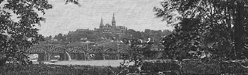 To be addedMile 1: The government commandeered the aqueduct during the Civil War, draining it and using the bottom of the trough as a road. To protect the aqueduct from Confederate attack, three forts were built on the hill at Rosslyn: Fort Corcoran, Fort Haggerty, and Fort Bennett. Along with several blockhouses, these defenses formed what Union generals termed a tete-a-pont (a fancy French phrase that translates literally to "bridge-head"). After the war, the bridge was turned back over to private ownership, and in 1868 the owners added a toll road on the top. In 1886, the trough of the aqueduct begain leaking and the bridge was closed to traffic. The government eventually persuaded the owners of the Aqueduct Bridge to sell it for $125,000, and the Corps of Engineers replaced the superstructure with an iron-truss road bridge that opened in 1888. (Congress had also authorized an alternative solution -- the construction of a new bridge across Three Sisters Islands, just upstream.) The canal route to Alexandria was no longer necessary, as steam tugboats were being used to propel the canal boats up and down the river from the Tidewater Lock (mile 0). Ironically, Key's house on M Street was later demolished for a ramp of the Whitehurst Freeway that connects to the bridge that bears his name. As a measure of recompense, a small park honoring Key has been opened on M Street, adjacent to the bridge and above the canal. Add to photo caption: Hahn dates this view as 1868, just before the addition of the roadway. Additional NotesThe Aqueduct Bridge: The original aqueduct was begun in 1833, but not completed until ten years later. Major William Turnbull of the Army Topographical Engineers was in charge of the project. The piers were made of gneiss boated down from quarries upstream. The original design was a timber "queen-post" truss construction. The design changed significantly in 1868, when arching Howe trusses were installed. Congress authorized the construction of a replacement bridge in 1916, and work began in 1917. When the Francis Scott Key Bridge was completed in 1923, the Aqueduct Bridge was abandoned, and its superstructure was removed in 1933. The old piers were not removed until 1962, though a portion of the pier nearest the Virginia shore was left as a memento. The defensive works in Rosslyn: