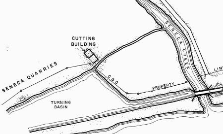 Additional NotesThe sandstone quarry is located on C&O Canal turning basin, but stone was quarried here long before the canal was built. In fact, quarrying had begun even before the American Revolution. During the 1790s, stone from this quarry was boated down the Potomac through the Seneca skirting canal to the locks under construction at Great Falls and Little Falls. The quarry was owned by the Peter family, who lived in Georgetown during the winter months and were close friends of George Washington. During the construction of the Federal City in the 1790s, George Washington was an occasional overnight guest at the home of Thomas Peter in Georgetown. (Thomas Peter married Martha Washington?s granddaughter.) The quarry?s proximity to the canal made it an obvious source of stone when construction began on the lower sections of the canal in 1828. However, the canal company first had to negotiate with John P.C. Peter to obtain land for the aqueduct on the west bank of Seneca Creek. A series of court decisions finally resulted in a payment of $2,143.50, which included rights for the company to quarry 20,000 cubic yards of materials from the adjacent land owned by Peter (the sandstone quarry at Seneca). Under the agreement, the canal company had 27 months to quarry the stone, and apparently made good use of the opportunity: the aqueduct over Seneca Creek and Locks 15-26 are largely constructed of the distinctive reddish stone from Seneca. In 1837 a sawmill was erected near the quarry, using water power from the canal basin to drive eight-foot long band saws that could cut one inch of stone per hour. Stone was brought from the quarry to the sawmill on a narrow-gauge track. The sawmill also cut stone from upstream quarries on Goose Creek (Loudoun County) and Whites Ferry. The mill was probably first powered by a water wheel, which was supplanted by a more advanced turbine. The National Park Service?s illustration of the sawmill (pages 68-69 of the Park Handbook) suggests that water was brought from the canal turning basin into the back of the building by a wooden trough. The water then ran from the sawmill into Seneca Creek.