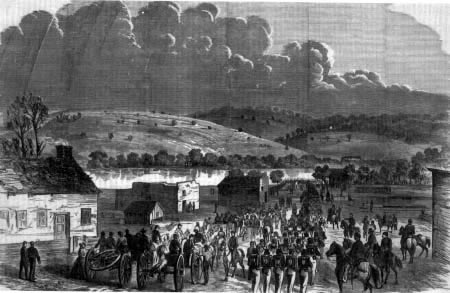 troops arriving at Edward's Ferry for crossing, October 1861.