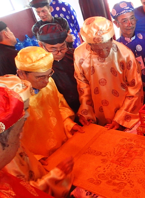 Above: Robed officiants perform the rites to the spirit-hero Thánh Gióng at the Đền Phù ĐổngBelow: Inspection of the royal scrolls (sắc phong) at the Đình Thắng Tam in Vũng Tàu.