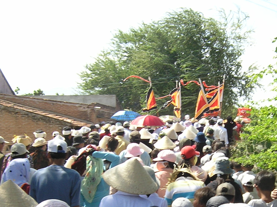 A crowd follows the procession to the outskirts of the Cham village of Hữu Đức, where they will receive the robes and ceremonial objects kept for them by the Raglai highlanders (October 2006). See the page on Phan Rang for more information. [link to: http://lesserscribe.net/Daiviet/Panduranga.html]
