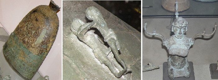 The Đông Sơn period (Bronze Age) is well-represented by castings from of drums, bells, daggers, and figures that have been unearthed along the Hồng (Red) River and the Mã (Horse) River. The name Đông Sơn, meaning “East Mountain,” refers to the place where some of the first artifacts were discovered. The name “Đông Sơn” is commonly used for this style of bronze drum, which is found in southern China and in other parts of Southeast Asia. (Chinese and Vietnamese scholars have engaged in a long running and rather ahistorical dispute over which country can claim to be the original source of such drums.)