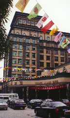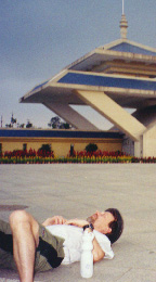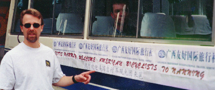 From the caves we took a lazy bus ride into Nanning. We had begun to entertain hopes for a nice shower and an air conditioned room, but then the van turned onto a road leading back out of town and up a forested ridge. After a gradual climb of several miles, the van approached an expansive modern pavilion with a good view of the city, its tall buildings softened by the sunlit haze of the evening. "Would you like to get out and ride?" one of our guides asked. We looked back at him dumbfounded. There was no particular reason for us to want to hop out and ride up hills, not after we had been letting our legs stiffen sitting around on the bus. Zhi Wei chuckled and explained that this was the television event to which they had alluded earlier. To give a good effect they would actually like to film the American bicyclists riding on bikes, preferably uphill a few miles to an even more elevated outlook. We could understand their concern that it would be somewhat incongruous for them to film the famous American cyclists in all their lycra regalia dismounting--a bus. Especially in this country where so many people travel only by bicycle. A compromise was worked out--they would drive us to the top of the hill, tape some interviews and then we would ride back down on our bikes. So that's how we ended up hurtling down a winding road through very lovely forest scenery, past a small lake and a hillock with a tall pagoda tower, staring over our handlebars at the camera poking out of the back of a truck. That night our guides took us back to the government compound for a special meal prepared in the tradition of the Zhuang minority, served by women and traditional costume with an occasional singing. The centerpiece of the night's meal was a small pig, served baby pink with a smile on its face. I could see that my largely vegetarian diet was going to be severely challenged over the next two weeks. But it was actually a blessing that I could only eat five of the sixteen courses--I wasn't going to pick up a lot of weight on this trip. |