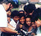 It was midday, so school was out as we grubbed out in the shade, trading places on the sole bench under the tree in front of the school gate. As the hour approached 2 o'clock, children started coming up the path, some in pairs, some accompanied by older siblings. The first few were timid, shrinking from us as they tried to find the shortest route to the gates and the safety of the school yard. As more of them gathered in the yard, they became bolder, and would edge out of the gate to get a closer look. We found that any attempt to photograph them would send them scattering back inside. However, Johnny was able to coax them out with his video camera, which had a fold-out screen that showed their faces while he was filming them. That won them over completely, as they began jostling and laughing, trying to get to the front of the pack to mug for the camera. The lure of the video was so powerful that not even the occasional flashes from our still cameras concerned them.