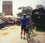 ![]() The new town: Robert and Stephanie choose to walk their bikes behind the slow-moving line of buses and trucks. (photo by gail thompson)