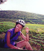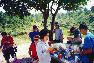 We dumped our stuff out by a couple of small huts, and began the lengthy preparatory rituals of American riders, smearing sunscreen, checking the film in the camera, choosing just the right items to take on the ride. The intrepid women discovered a water closet perched on the far side of the road&emdash;an unroofed brick enclosure about 4 feet high and 6 feet square. Of course, there was no flushing mechanism, just a hole on the far end opening onto the steep hill slope where we presumed the 'fertilizer' was intended to go. The road south was narrow but mostly paved and not heavily traveled. The route generally trended downhill, following the river valley towards the coast. Aside from a little repair work on one stretch, the road was in good condition, a little patched and a little worn like any backcountry road in the U.S. But we did find some inclines, and the heat of the late morning and afternoon helped us work up a respectable sweat.
