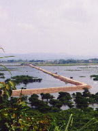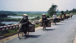 It was getting quite hot very fast, as we descended to the coast, passed dykes that formed fishponds, crossed an old truss bridge and began a steep uphill. I found some shade on one side of the road where it cut a channel through the ridge top and let a nice breeze cool me off. Lowering the core temperature, I thought, that's the key. We worked our way inland, up a fairly steady grade that topped out around noon, and then I was sailing downhill. Towards the bottom of the descent, I came across the truck and a few riders. This was as far as we were to go that day. We waited a little while for the passenger van to double back, and exchanged a few priceless cyclists' secrets. (Did you know that there is actually an ointment product called "Chamois Butt-r"?) Getting on board, I noticed that Sen was gone. Well, I thought, it was to be expected. The handlers had probably noticed our mutual interest and had hurried her off to forestall a defection. And it was all for the best, from my point of view. I could see the whole plot unfolding -- the impetuous romance, smuggling her out in a duffel bag, the May-September marriage, the three-year wait for citizenship, and then the inevitable breakup. I had to thank my lucky stars that the Politburo had been on the case. Richard was travelling now with a box full of pith helmets. He had gotten a deal on a set of four that he just couldn't resist. "I have no idea what I'm going to do with these when I get back to Mississippi," he confessed. "Open a Richard's Pith Helmet Hut in downtown Greenwood," I suggested.