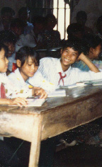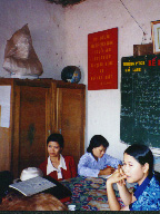 The two primers in use were of the Jack and Jill variety, targeted to different grade levels with parallel Vietnamese and English phrases. I recall one of them beginning with an account of Jack's difficulty in rousing himself from bed to go to school. I took this as a very heartening sign that this weakness so well known to me had not been stamped out as a vestige of bourgeois decadence. I took down the teacher's address and promised to see what I could do to send her some books. Back in the schoolyard, class had let out, and a riotous crowd of kids surrounded the cyclists. I mingled for a few minutes, until (Manchurian) Dong quietly suggested that it was time to go. The hills and lush valleys suggested a slow-paced agrarian lifestyle,and so did the houses. We passed one where the main room was completely open to the road, with a motorcycle parked right next to bed.