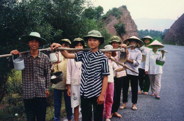 It was a very quiet morning in this neat little town. After breakfast, I wandered around the square in front of our hotel looking for a shop that sold film. A couple of places with photocopiers were open, but they had no film. Across the way, I saw a woman bringing out the trash from our hotel, and then loading the dishes from breakfast into her basket. Our morning's preparations went largely unobserved here, where it had drawn onlookers in the moderate-sized towns of Feng Cheng and Mong Cai. We rode through the narrow but neat back-streets of Tien Yen and down to the river on the far side of town, eliciting only a few glances from the early risers. Just in front of one shop two men were cutting lumber with a double saw. So far, the northeast corner of the country had proven to be decidedly low-tech compared to China. The road on the town side of the river was under construction, so we doubled back and crossed a bridge to the paved road on the other side. It was to be a short day -- maybe 25 miles -- because the guides had planned to have us ride the van through the coal towns along the coast. Here, we had been warned, we would be blackened with the dust, just as the laborers were.