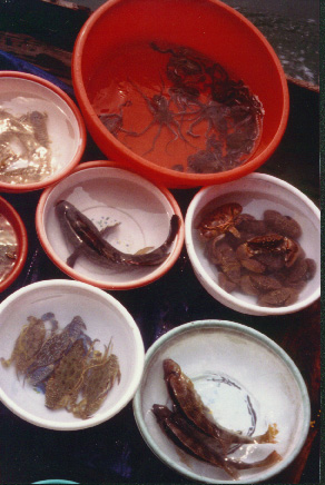 Of more interest was the one boat that approached us with live fish, crabs, and squid for sale. The sea creatures were scooped out of a live well into ceramic bowls for our inspection. A few of the squid and at least one of the fish were swiftly added to the menu.