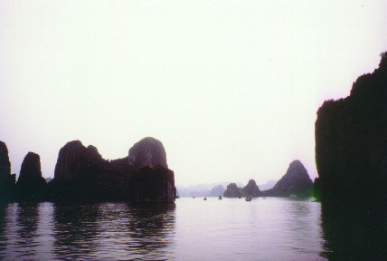 Our scheduled boat ride around the bay almost ended before it began, as a fierce squall blew in, driving everyone off the piers and causing the vendors to unfurl sheets of plastic over their stands. The winds were so strong that we were thinking typhoon or a day-long monsoon, but it petered out after 40 minutes and we left the safety of the bus for the vagaries of the waves. The boat was a comfortable seasoned wooden tub, the passenger cabin ringed with windows, so we didn't have to miss any of the scenery because of the weather. The sky cleared nicely as we went along, past rows and rows of those curious limestone karsts poking up from the sea floor. As it grew warmer and more humid, we slid the window sashes up to let the air circulate. When we lost sight of the harbor and land, we had no way to tell where we were in a wilderness of several hundred islands. As we made our way through the bounding main, we were buzzed by the occasional motorized sampan with coral for sale. Being the eco-sensitive type of tourist, though, we refrained from purchasing any of the subaquatic infrastructure. Not too long ago, these approaches would have been alarming -- before the government cracked down, robber/pirates commonly overhauled tourist boats in the bay. |