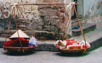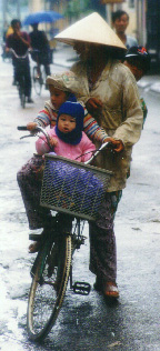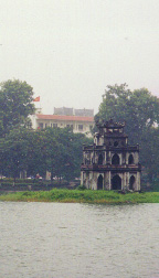 This day we were "on our own," and it began rather badly for me. I determined to walk down to the South end of the lake to find the two international bookstores on Trang Tien street. But it began to rain heavily, so I snagged a cycle, overpaid (and knew it) for the 6-block ride, took a wrong turn on foot and ended up in a warren of backstreets where everyone was puzzled to see a confused hatless foreigner wandering around in the rain. Fortunately, the language barrier was a readily available excuse for not asking directions. My cycling jacket was completely inadequate against the monsoon, but I meandered on, steadfastly refusing the offers of brightly colored rain ponchos at every turn, and even some conical hats. I finally did return to the lake, where I purchased a quite servicable blue cap with a bill, bargaining down from $2 to $1. (A very well-made cap, I have to say some months later -- it continues to provide good service in the Mid-Atlantic winter.) After a few more minutes wandering the lake, I finally realized that had made a near-complete circuit, and was close to the hotel but hopelessly far from the bookstore. So I returned for lunch with the others. Back in the room, I found they had taken my pile of clothes and sent them to the laundry, assuming that was the sensible thing to do (other than burning them). So it was a quick foray to the clothing shop next-door, an upscale place that operated according to Western rules: fixed price, salaried clerks, who didn't seem to particularly care if you bought anything or not. I revelled in the privacy and peace of mind as I selected a slick-looking shirt for 144,000 dong. It was well worth the price for air conditioning and a moment's respite from the bustle of commerce. |