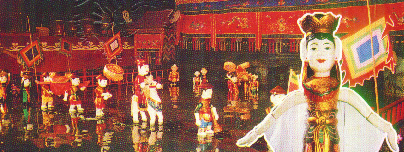 Our last evening began with a wild bus ride to a far corner of town, to find an opulent Chinese restaurant tucked away down a narrow alley. The Chinese of Vietnam have persevered, and in many cases even prospered, despite persecution from the government and the forcible deportation of 500,000 who wound up in refugee camps in South China. Given this sad and recent history, it was amazing to find ourselves in the most modern and well-kempt restaurant of our tour: Brightly lit, with perfectly varnished wood floors and railings, immaculate furniture, and a wireless microphone being passed around the tables for a ghastly round of karaoke. The owners were getting along quite well indeed, perhaps proving that the right protection money to the right officials could overcome just about anything. Followed a final salvo of the exotic, the raw, the cooked, the peculiar, and in some cases the grotesque (to Western taste) cuisine of this corner of the Orient. Don't get me wrong--I enjoyed what I ate. But I only ate from about a fourth of the courses. There was no need for self-criticism, I thought. My culinary experience was probably authentic, as the majority of the Vietnamese make do with a short menu and very little meat. And after that, it was a quick ride back over to East Lake for the Water Puppet Theatre, the other most wonderful thing (along with the Ethnographic Museum) that I found in Hanoi. A small orchestra in traditional dress sat at stage right, and began the performance with singing and instrumental accompaniment.